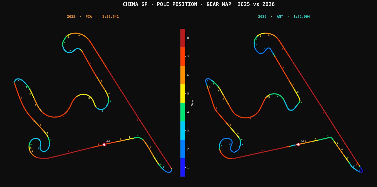 The clearest way to see what changed is to look at the data. Below are speed and gear traces from qualifying, comparing the same circuit in 2025 and 2026.