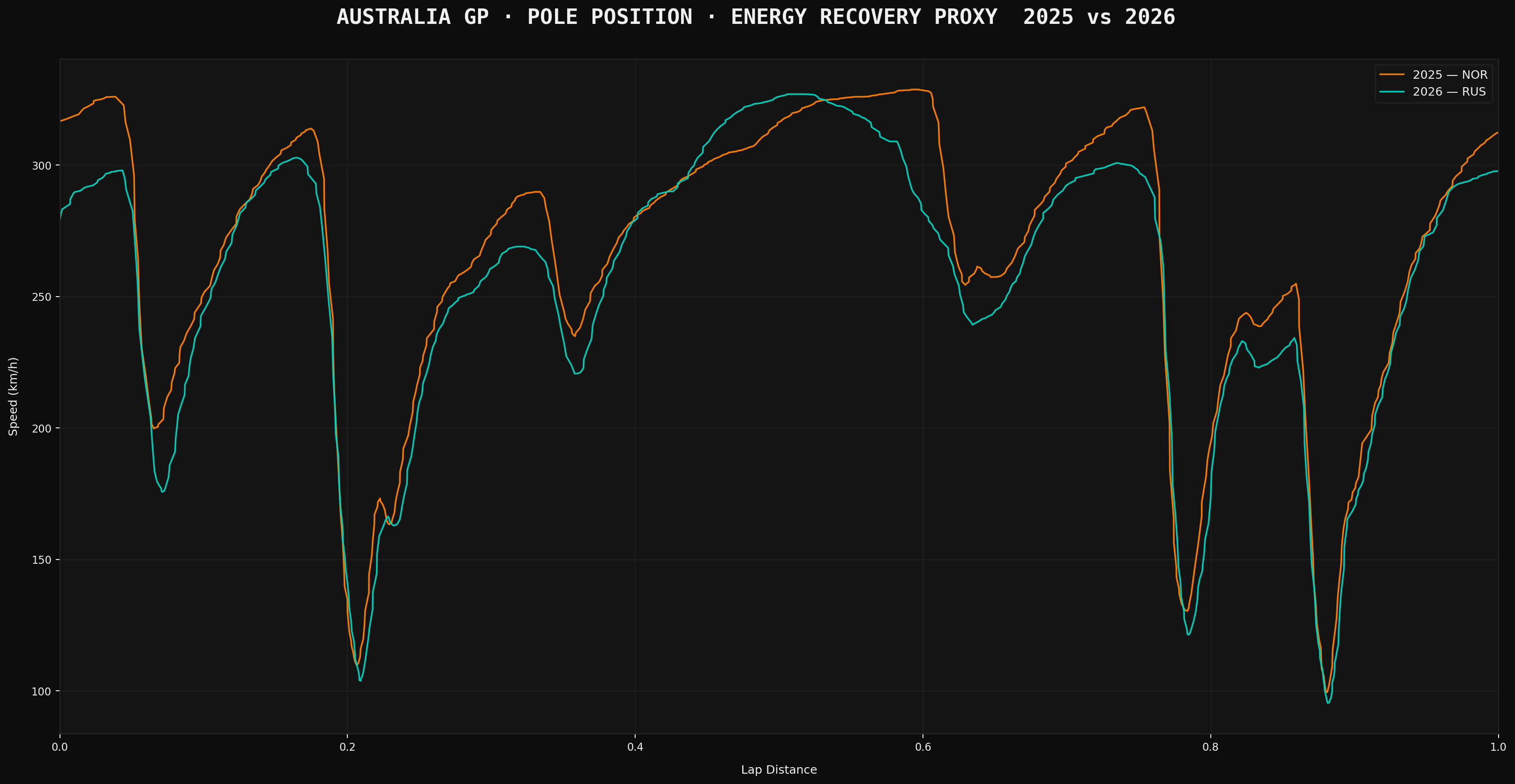 In 2025, the pattern is simple: speed builds steadily to the braking point, then drops sharply. In 2026, there are one or more steps where the car slows by around 50 km/h well before the braking zone, then recovers, then brakes normally. These steps are not the driver lifting. They are the power unit pulling energy from the engine to recharge the battery while the throttle is still fully open. That is superclipping.